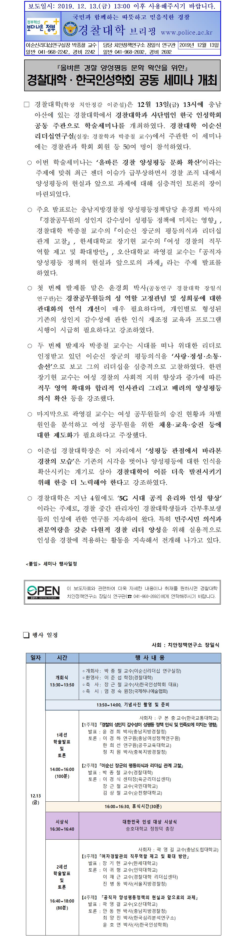 경찰대학·한국인성학회 공동 세미나 개최 보도