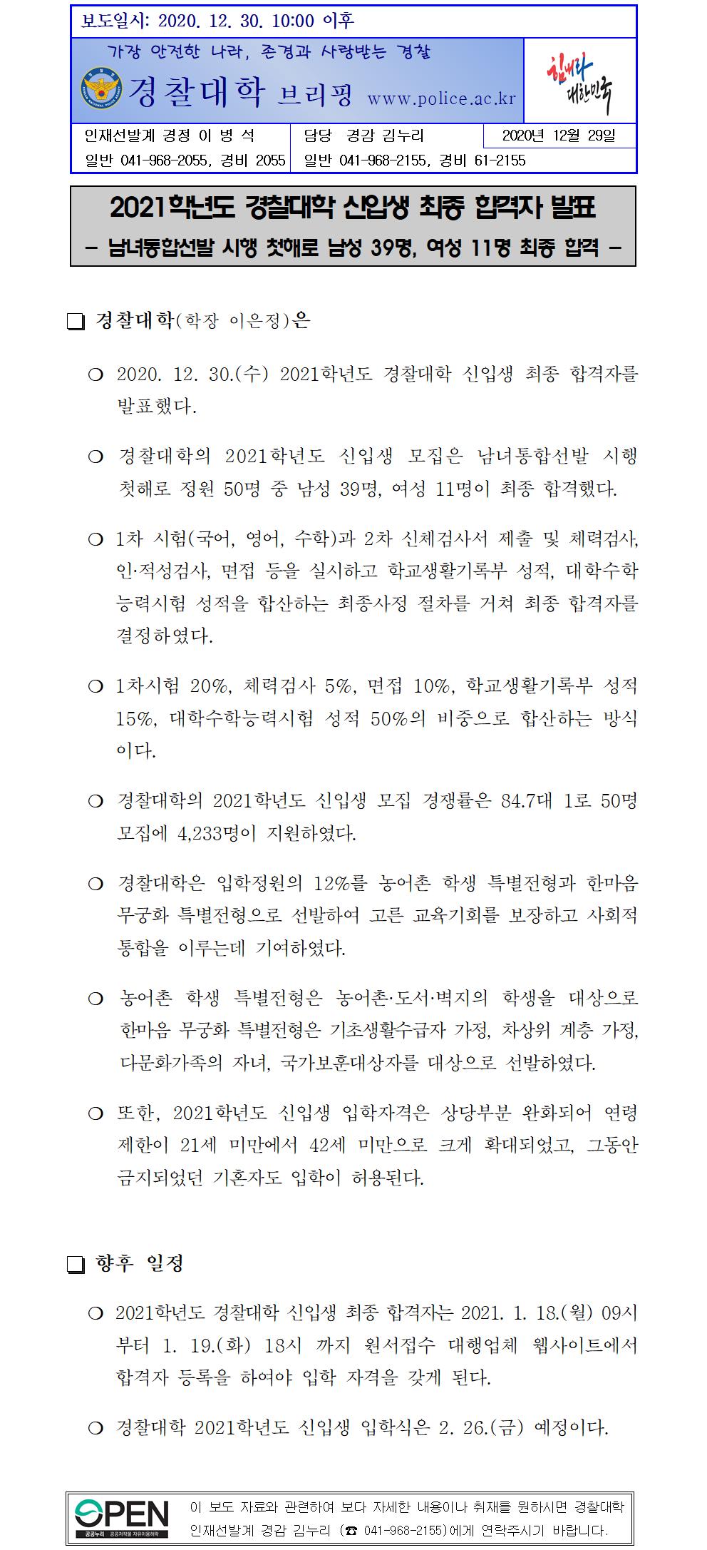 2021학년도 경찰대학 신입생 최종합격자 발표
