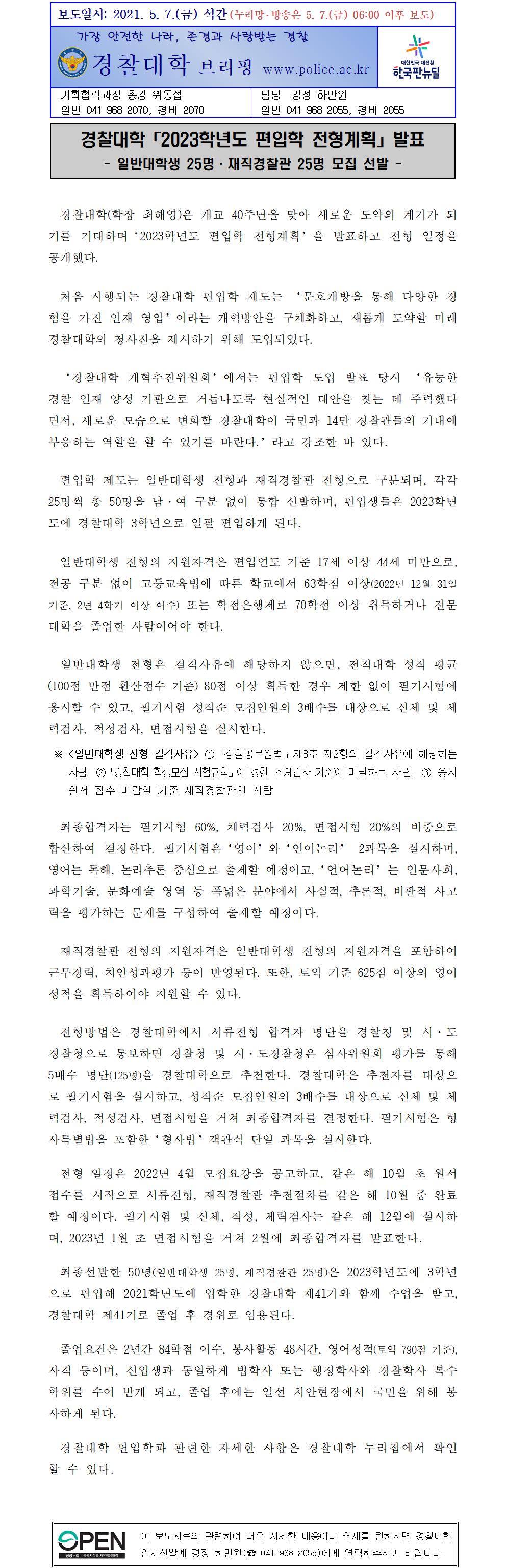 2023학년도 경찰대학 편입학전형 시행계획 보도자료