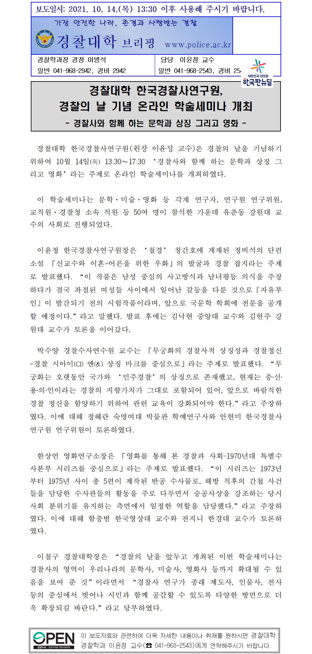 경찰대학 한국경찰사연구원 10월 온라인 학술세미나 개최