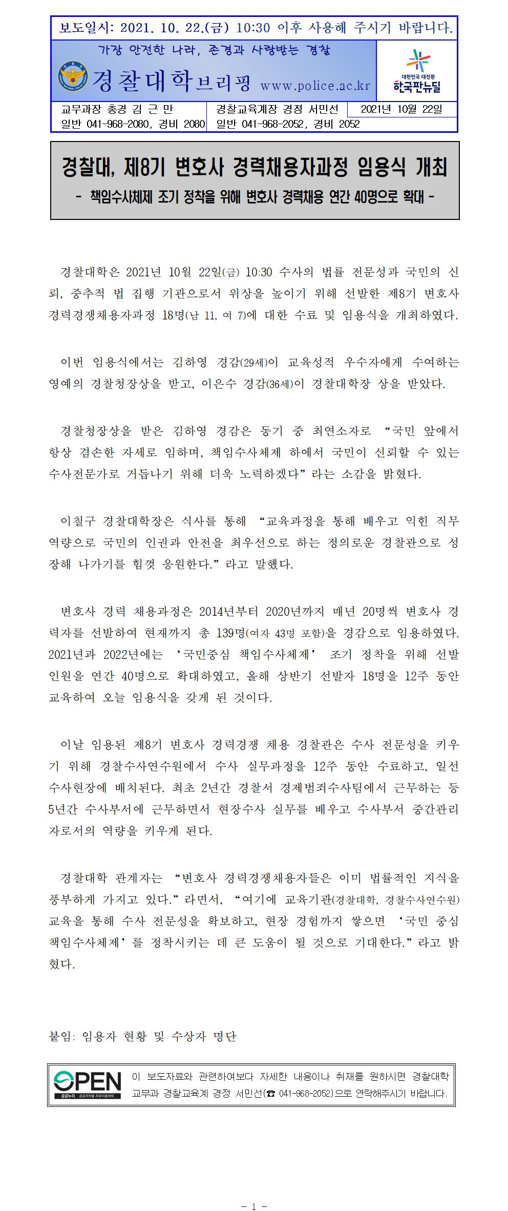 제8기 변호사 경력채용자과정 임용식 개최 보도자료