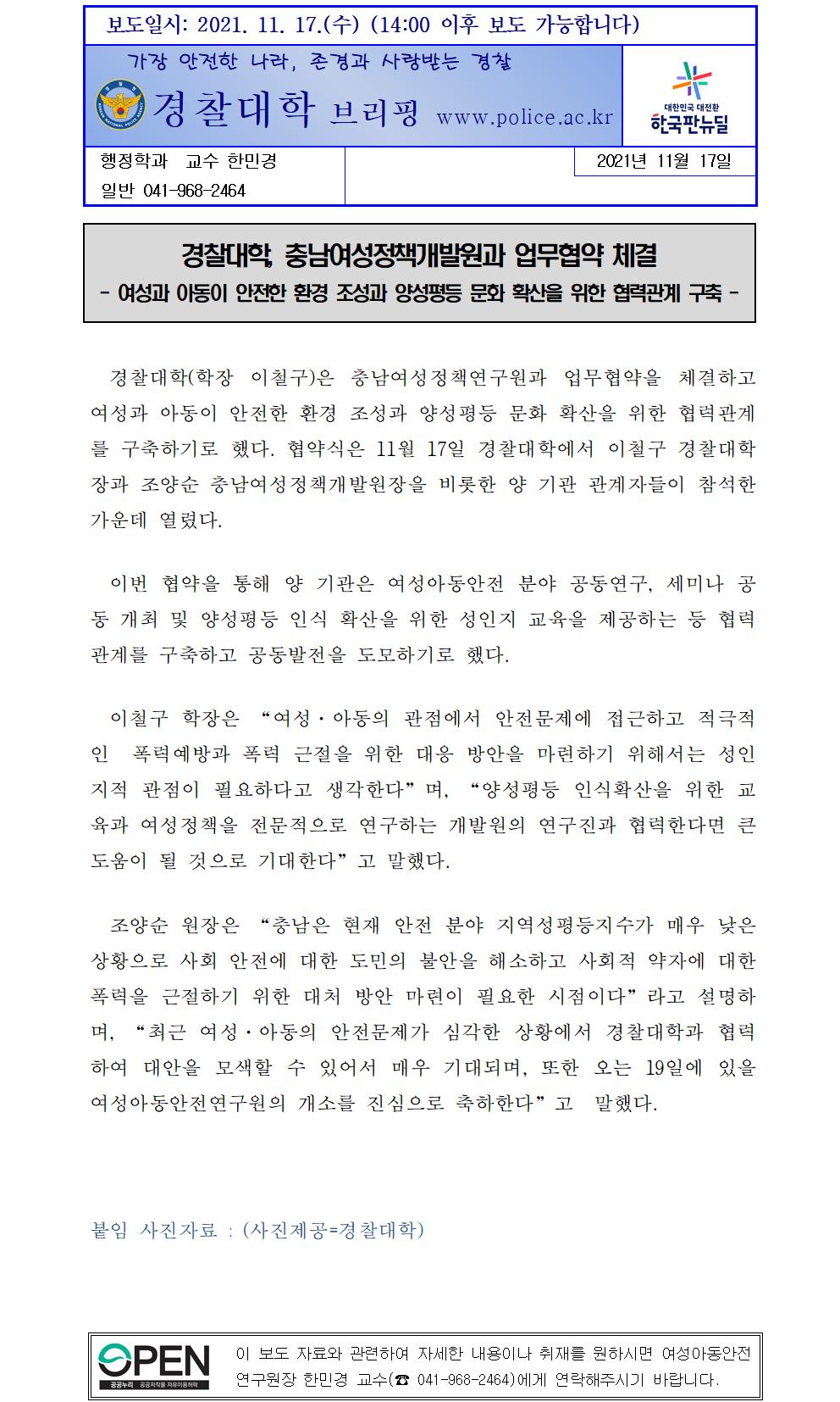 경찰대학 충남여성정책연구원 MOU 관련 보도자료