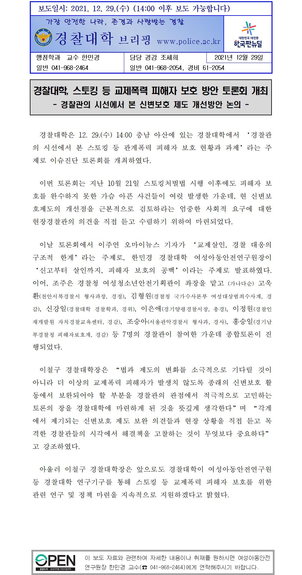 경찰대학 스토킹등 교제폭력 피해자 보호 방안 토론회 개최 보도자료
