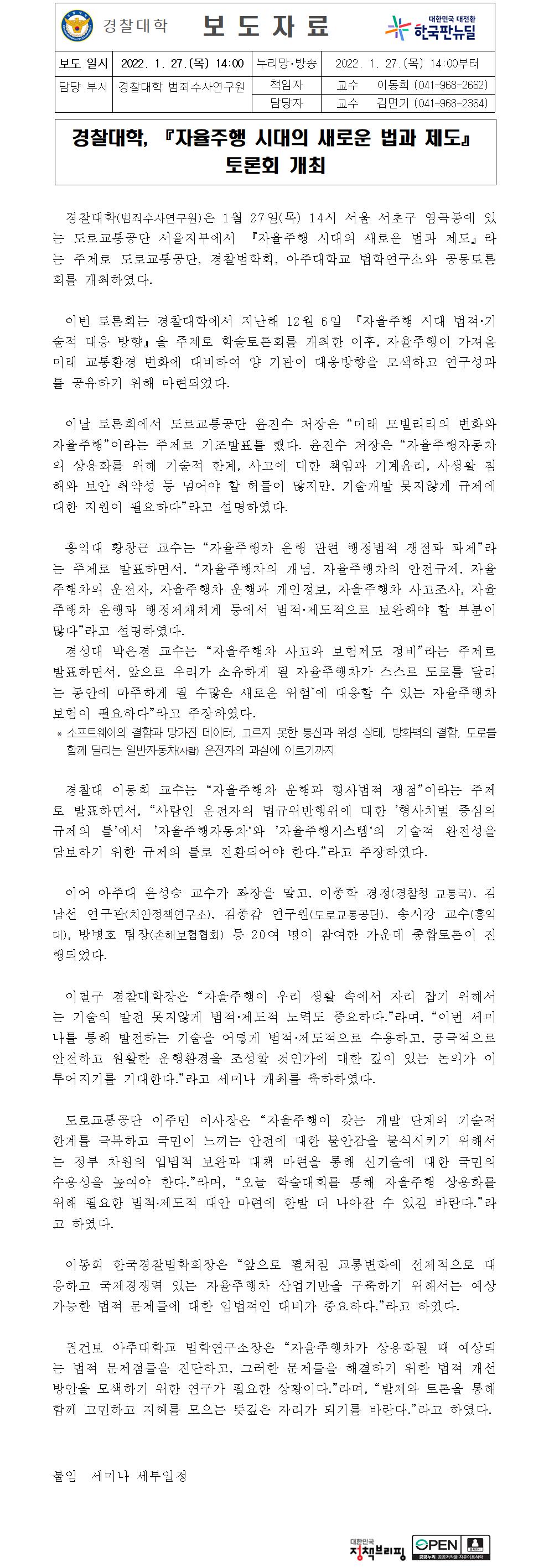 경찰대학, 자율주행시대의 새로운 법과제도 세미나 개최