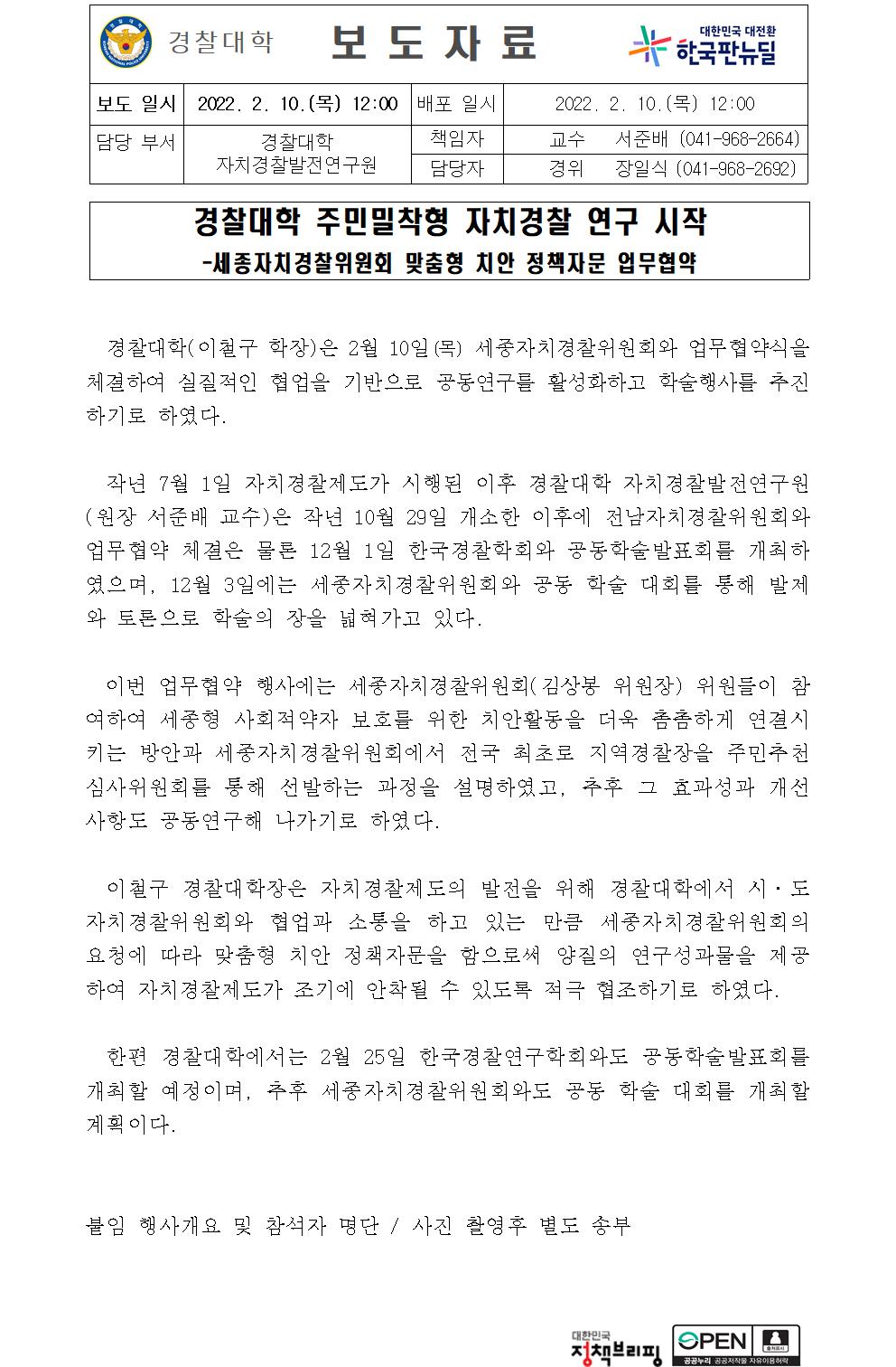 경찰대학 세종자치경찰위원회 맞춤형 치안 정책자문 업무협약