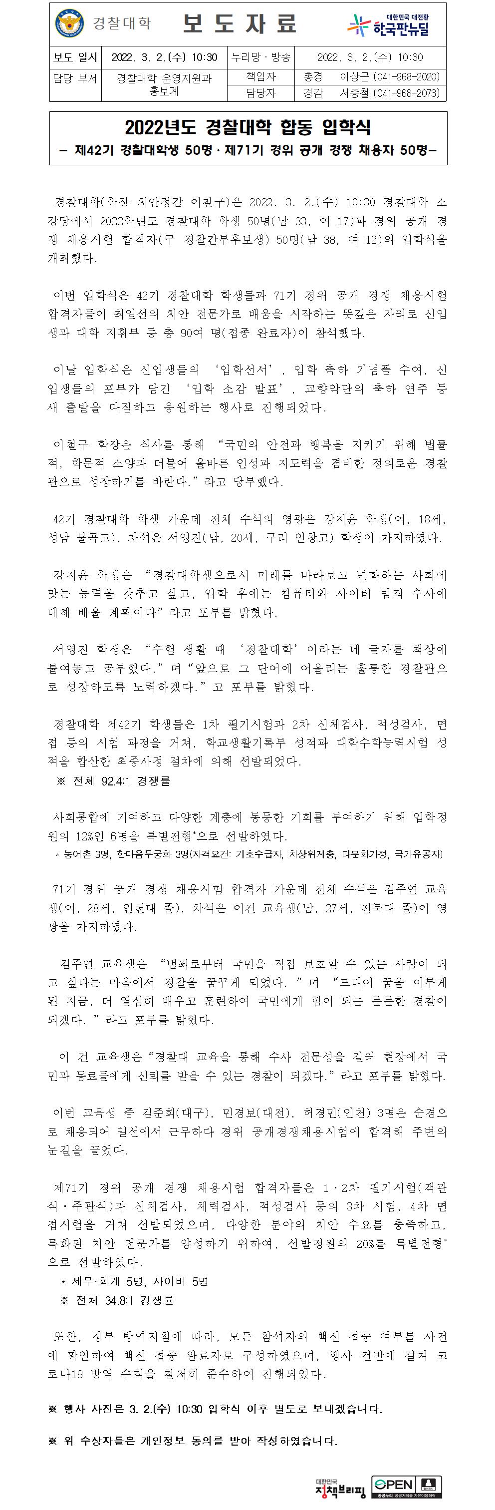 2022년도 경찰대학 합동 입학식 보도자료