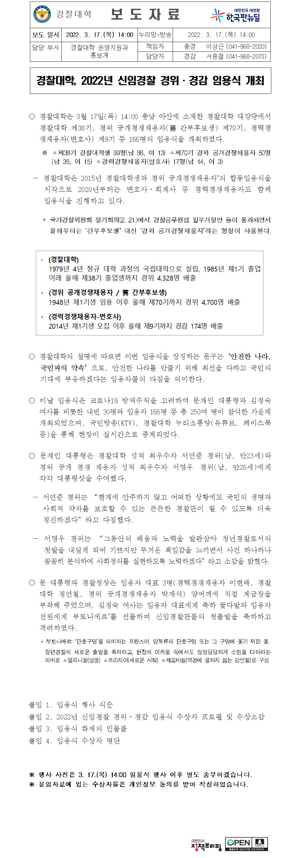 경찰대학, 2022년 신임경찰 경위·경감 임용식 개최 보도