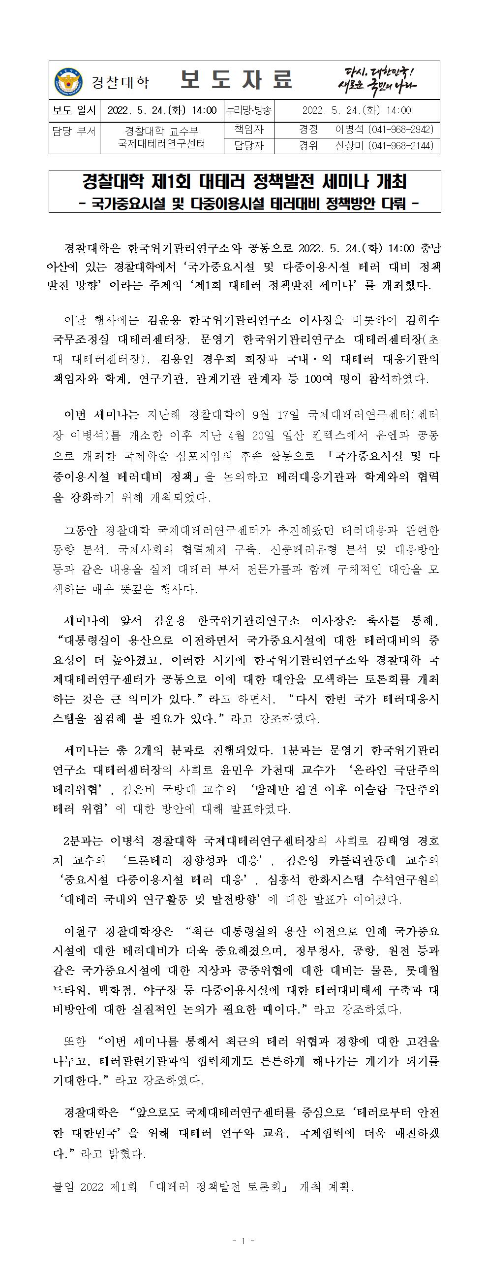 220524 제1회 대테러 정책발전 세미나 개최 보도자료(붙임).hwp