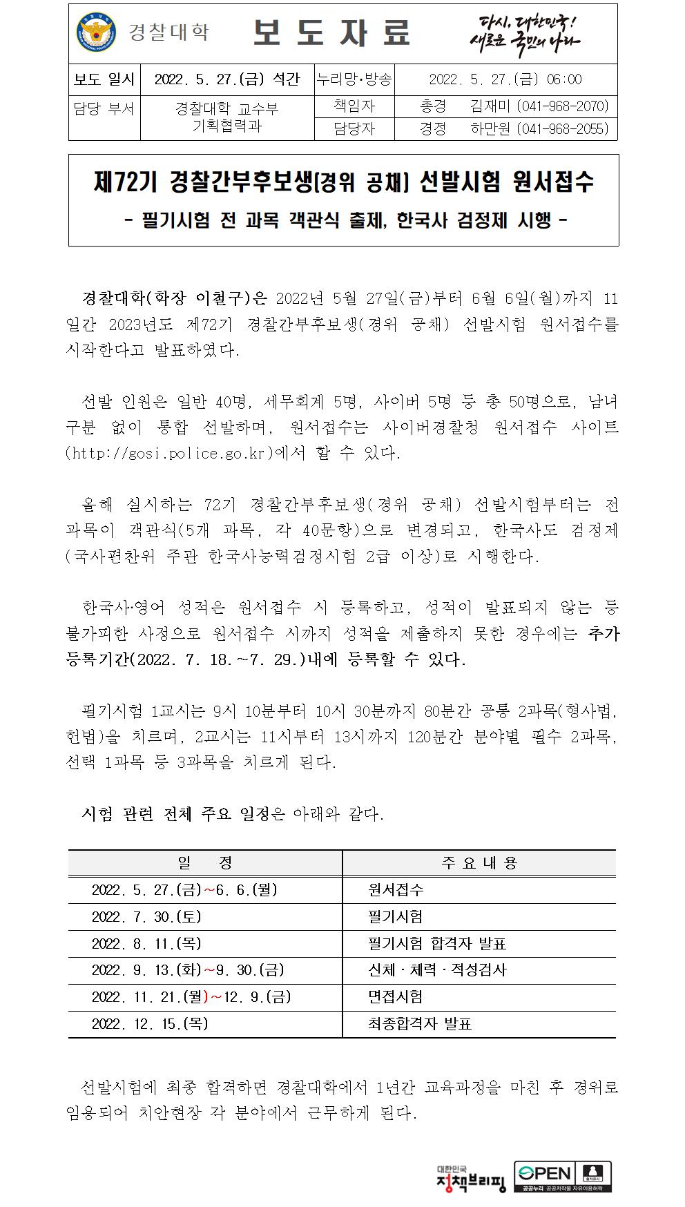 제72기 경찰간부후보생(경위공채) 선발시험 원서접수 보도