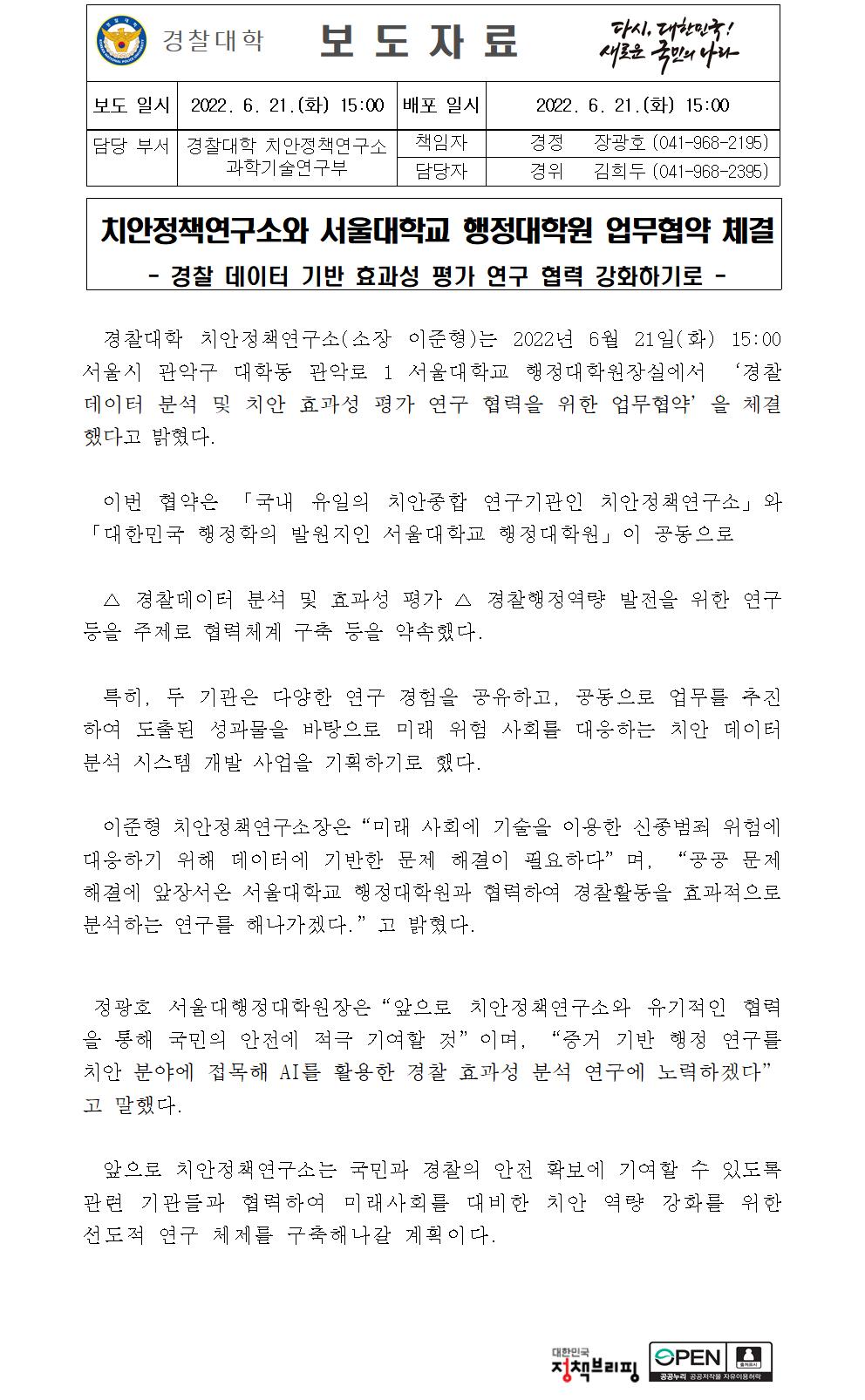 치안정책연구소와 서울대학교 행정대학원 업무협약 체결 보도