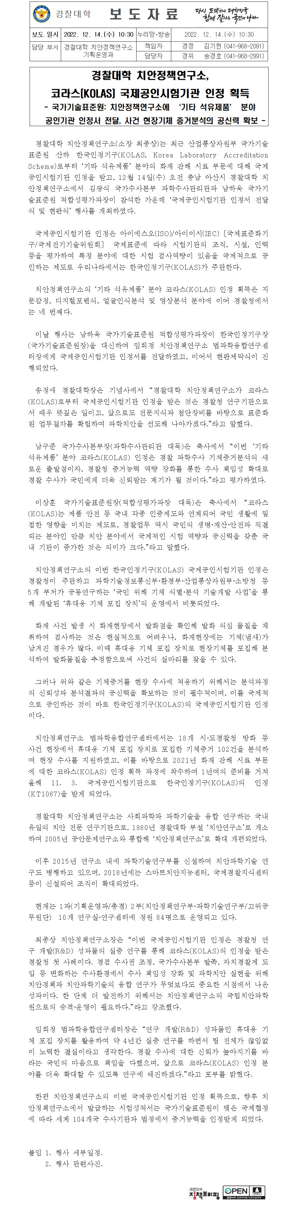 경찰대학 치안정책연구소, 코라스(KOLAS) 국제공인시험기관 인정 획득