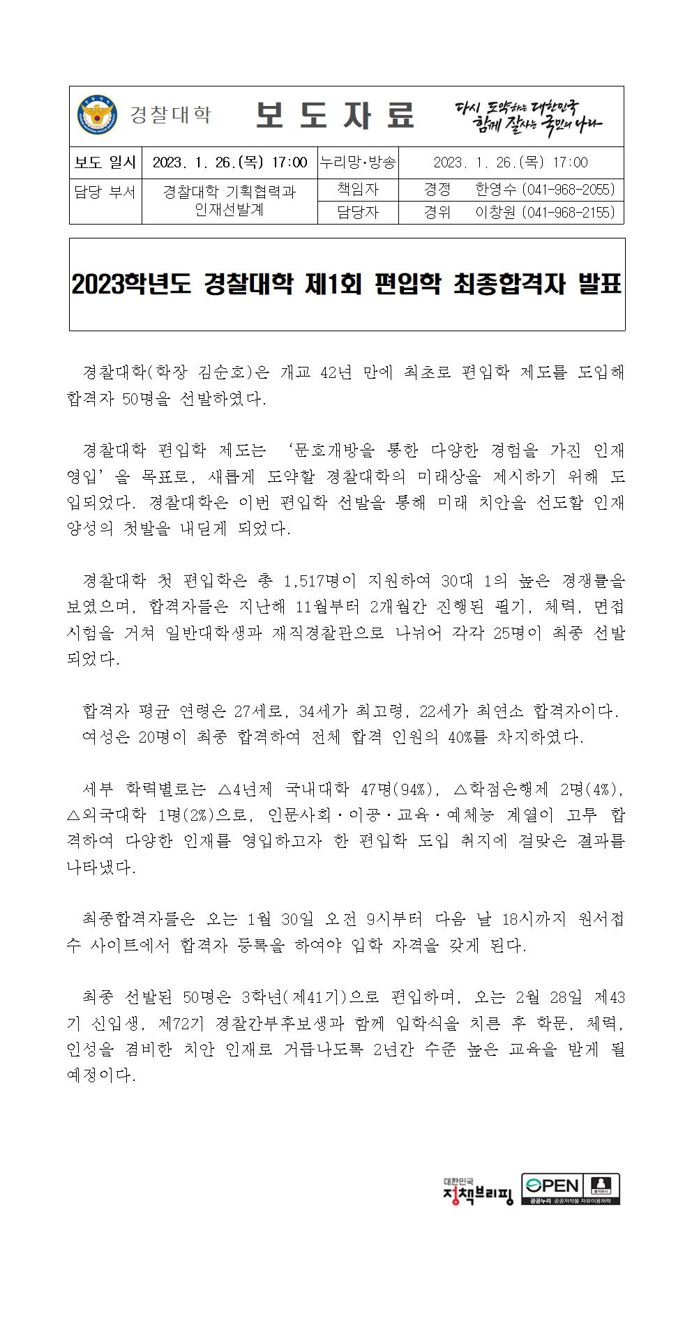 2023학년도 경찰대학 제1회 편입학 최종합격자 발표