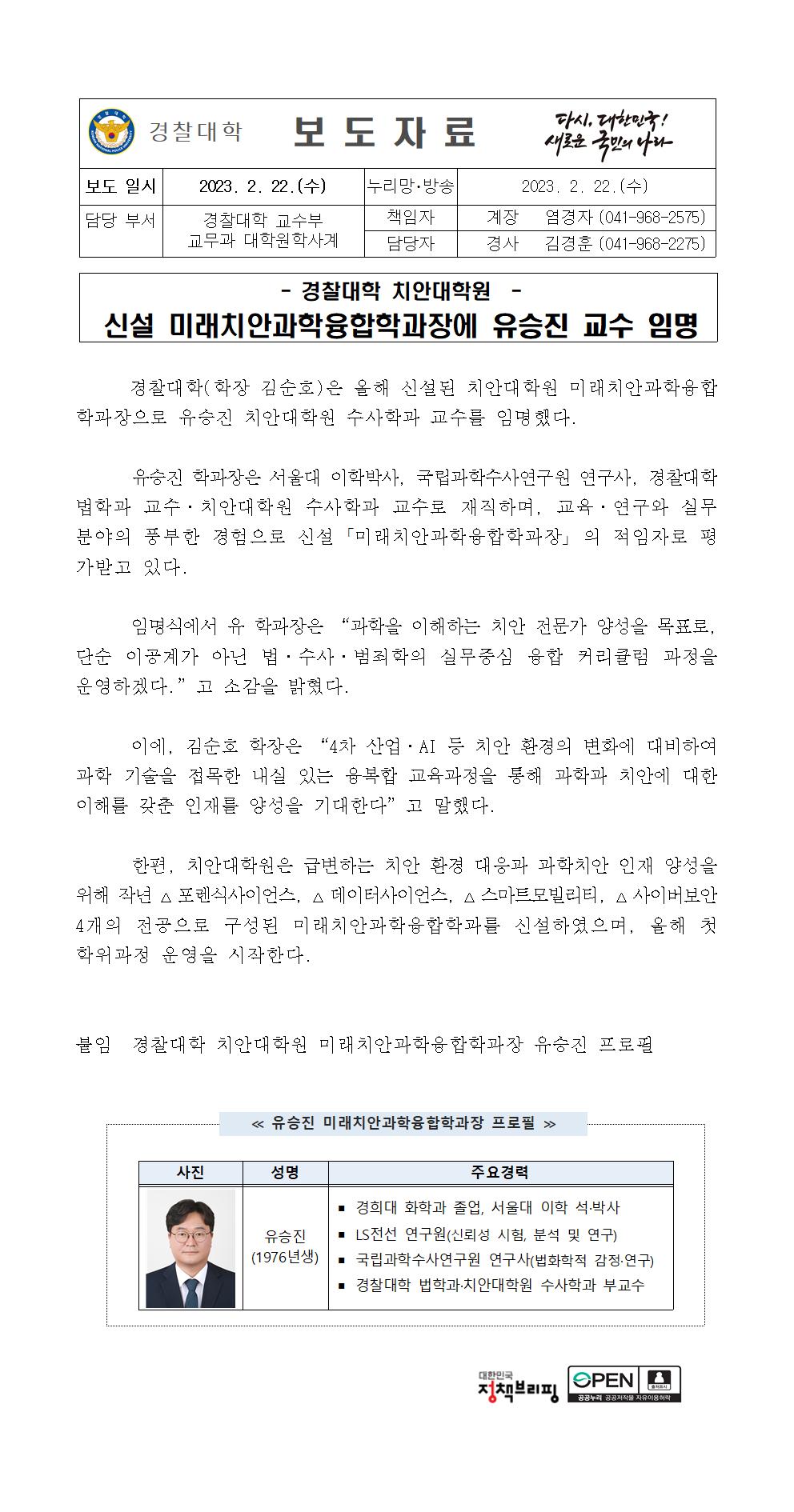 신설 미래치안과학융합학과장에 유승진 교수 임명