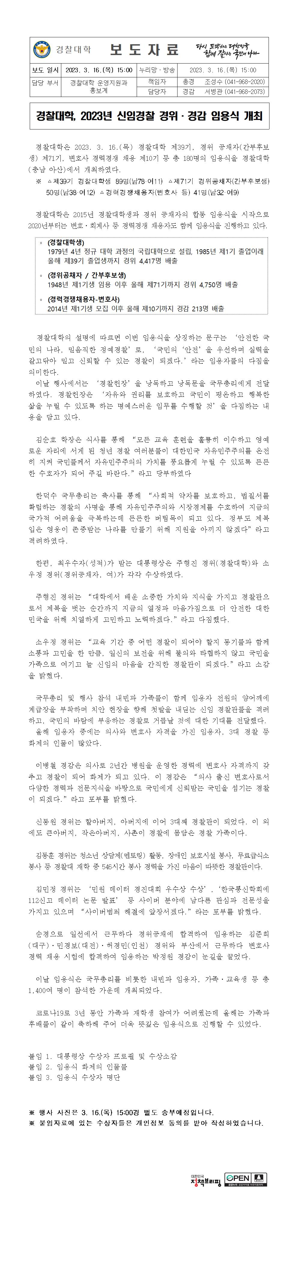 230316(1502) 23년 신임경찰 경위·경감 임용식(경찰대학).hwpx