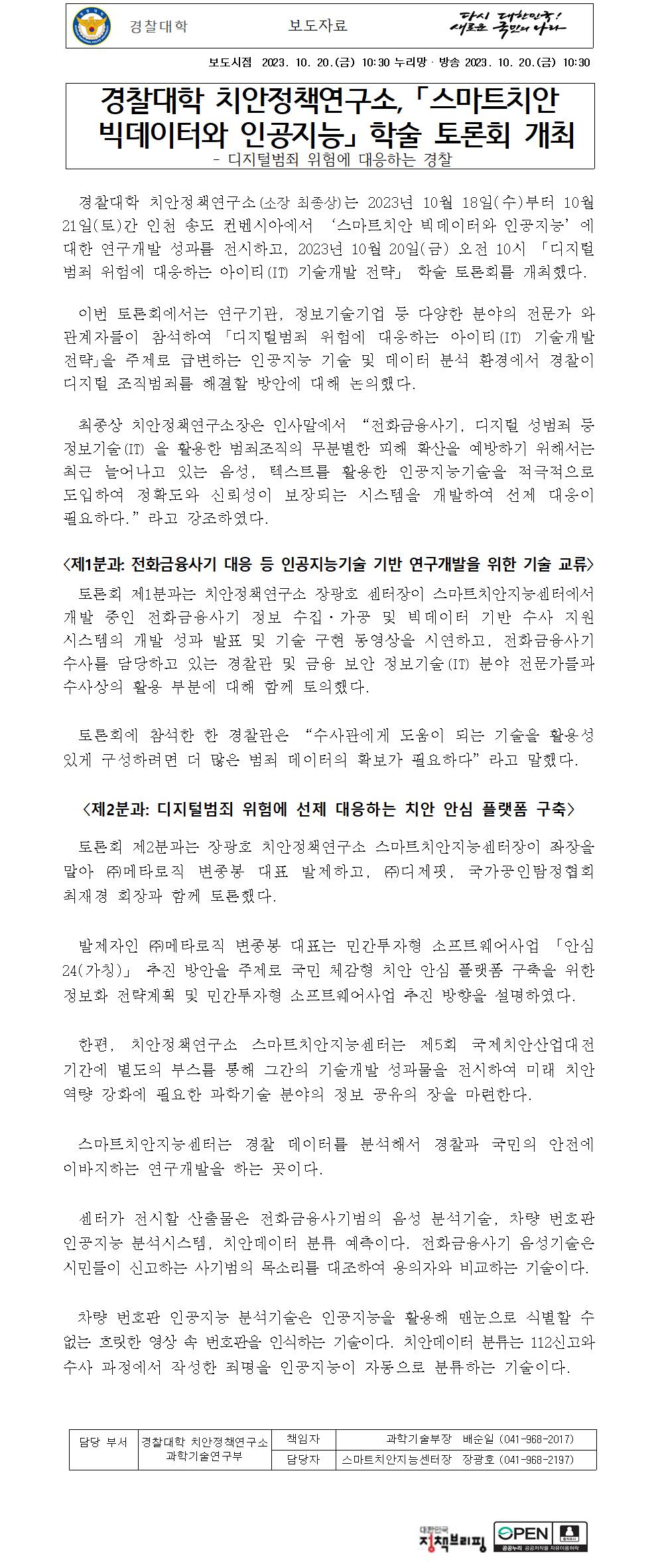 231020 치안정책연구소 스마트치안지능센터 학술 토론회 개최(경찰대학).hwp