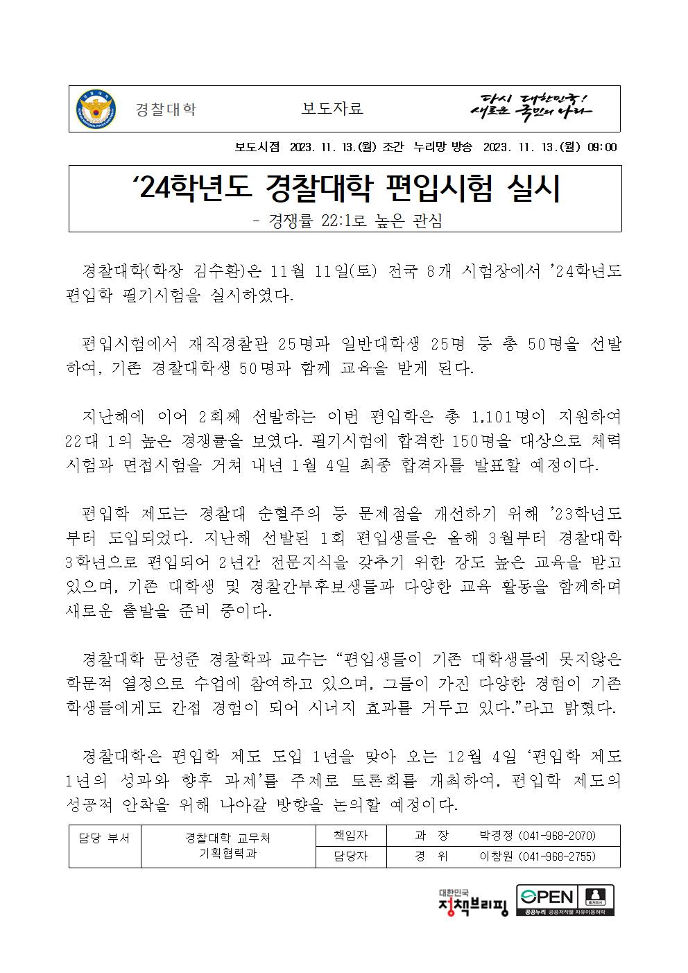 231113 (조간용_감수안) 경찰대학 제2회 편입학 필기시험 실시(경찰대학).hwp