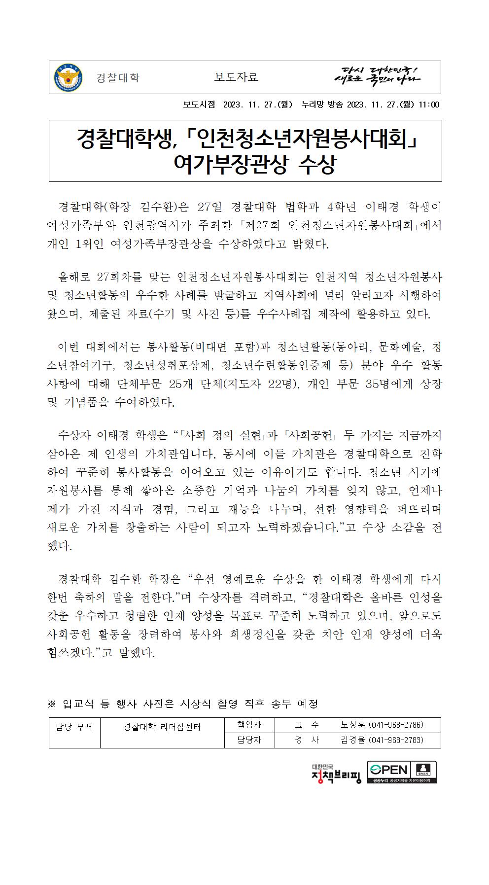 231127 (11시) 경찰대학생, 제27회 인천청소년 자원봉사대회 여성가족부장관상 수상(배포용).hwp
