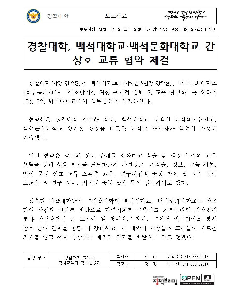 231205 (15시30분) 경찰대학_백석대학교_백석문화대학교 업무협약 체결(배포용).hwp