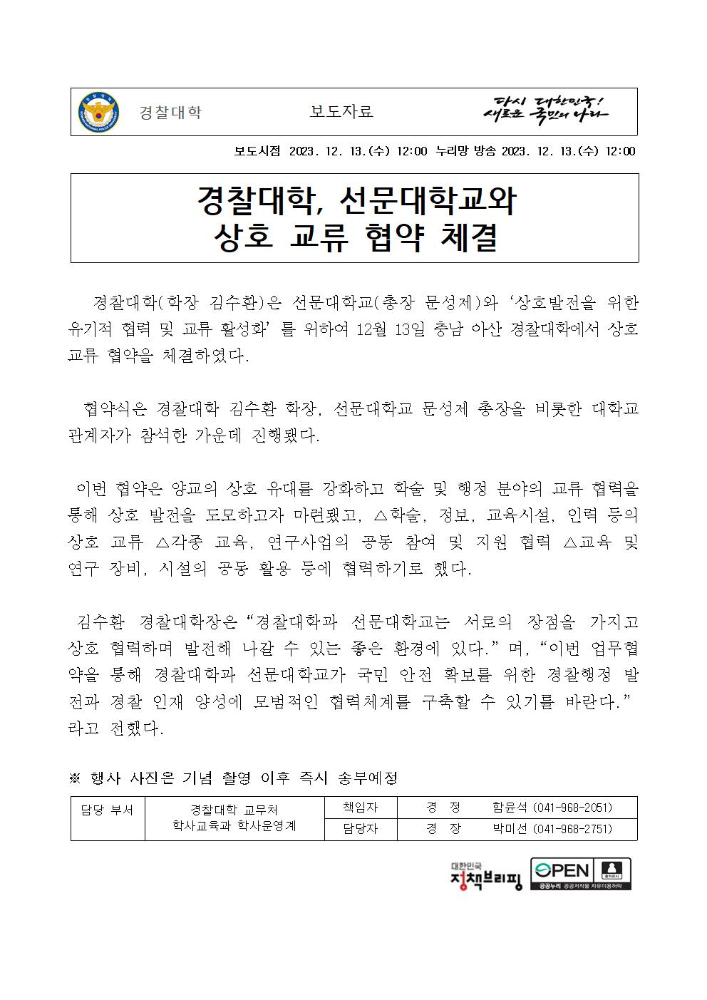 231213 (12시) 경찰대학,선문대학교 MOU체결 보도자료(배포용).hwp