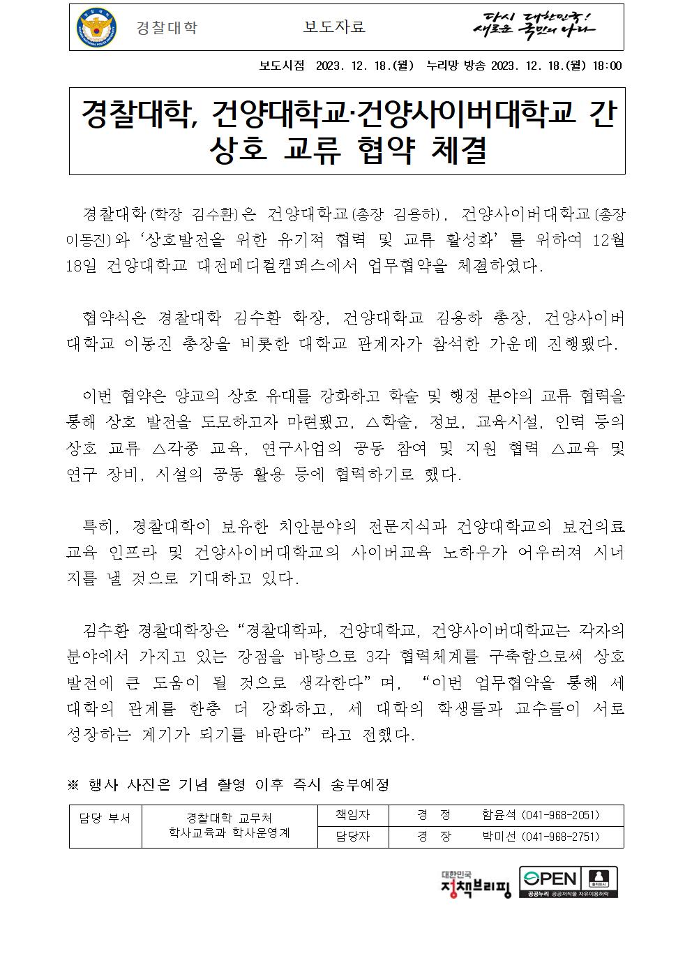 231218 (18시) 경찰대학_건양대학교_건양사이버대학교 MOU체결(배포용).hwp
