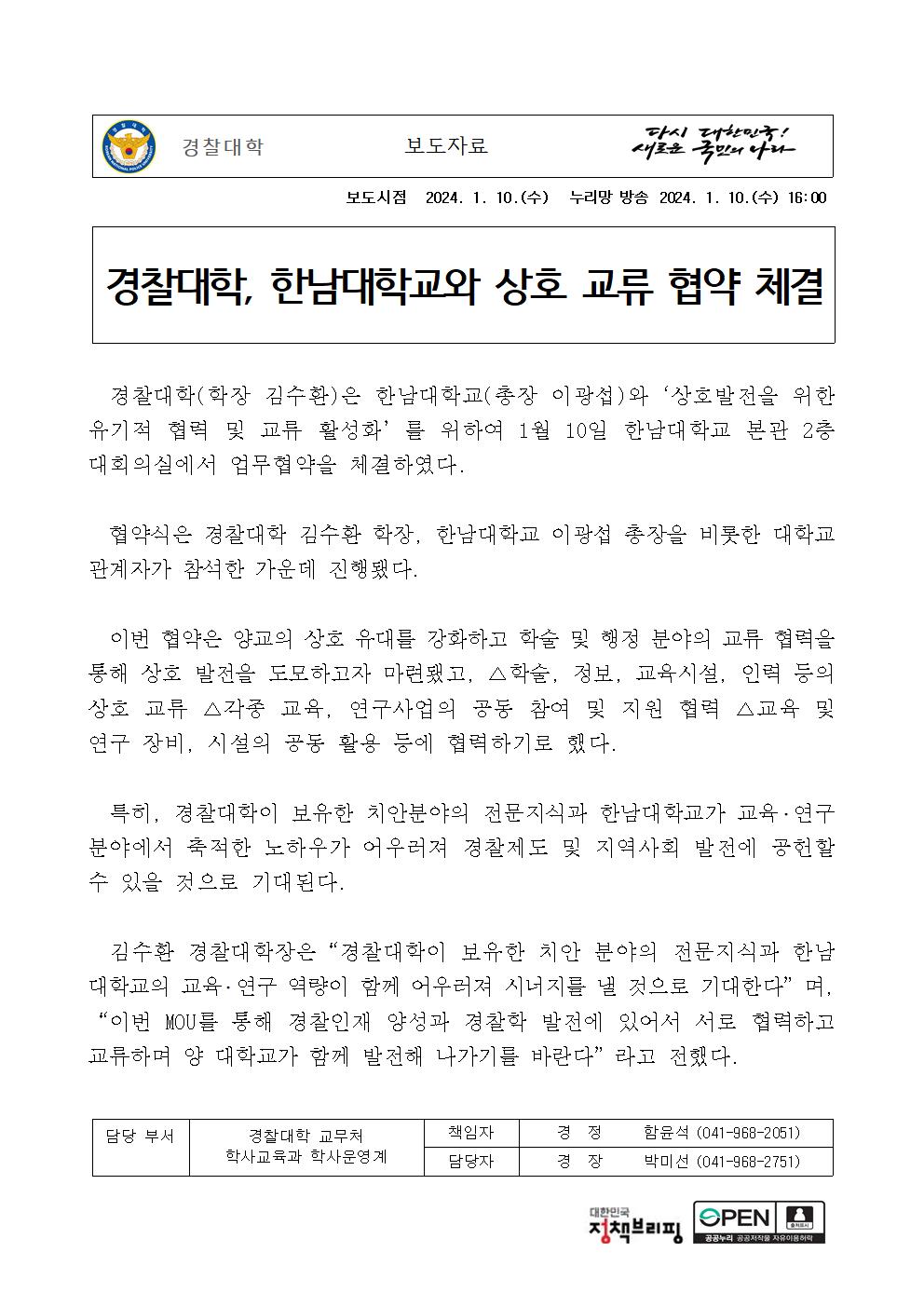 240110 (16시) 경찰대학_한남대학교 MOU체결 보도자료(배포용).hwp