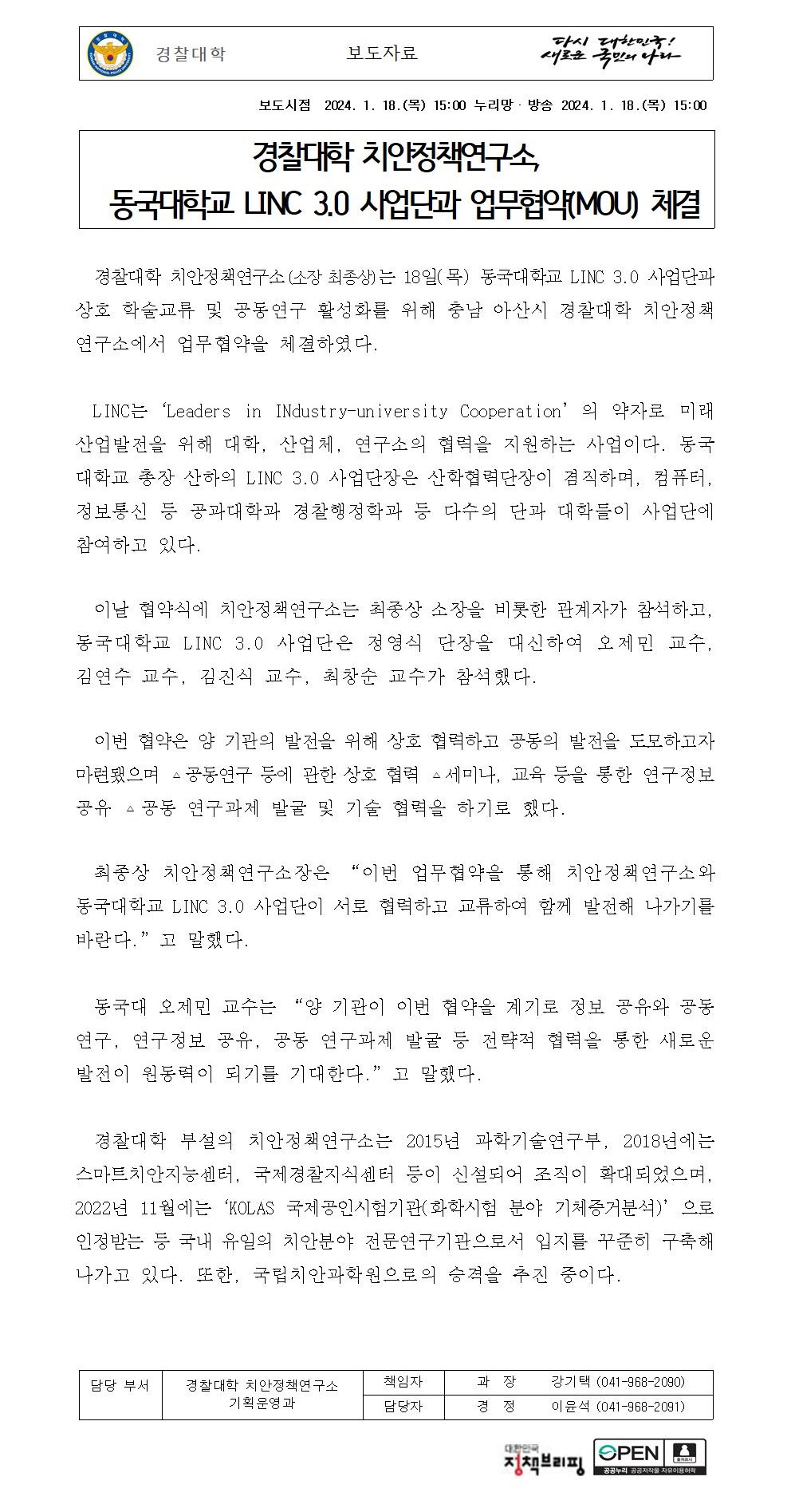 240118 (15시) 치안정책연구소_동국대학교 LINC 3.0 사업단과 업무협약 체결 (배포용).hwp