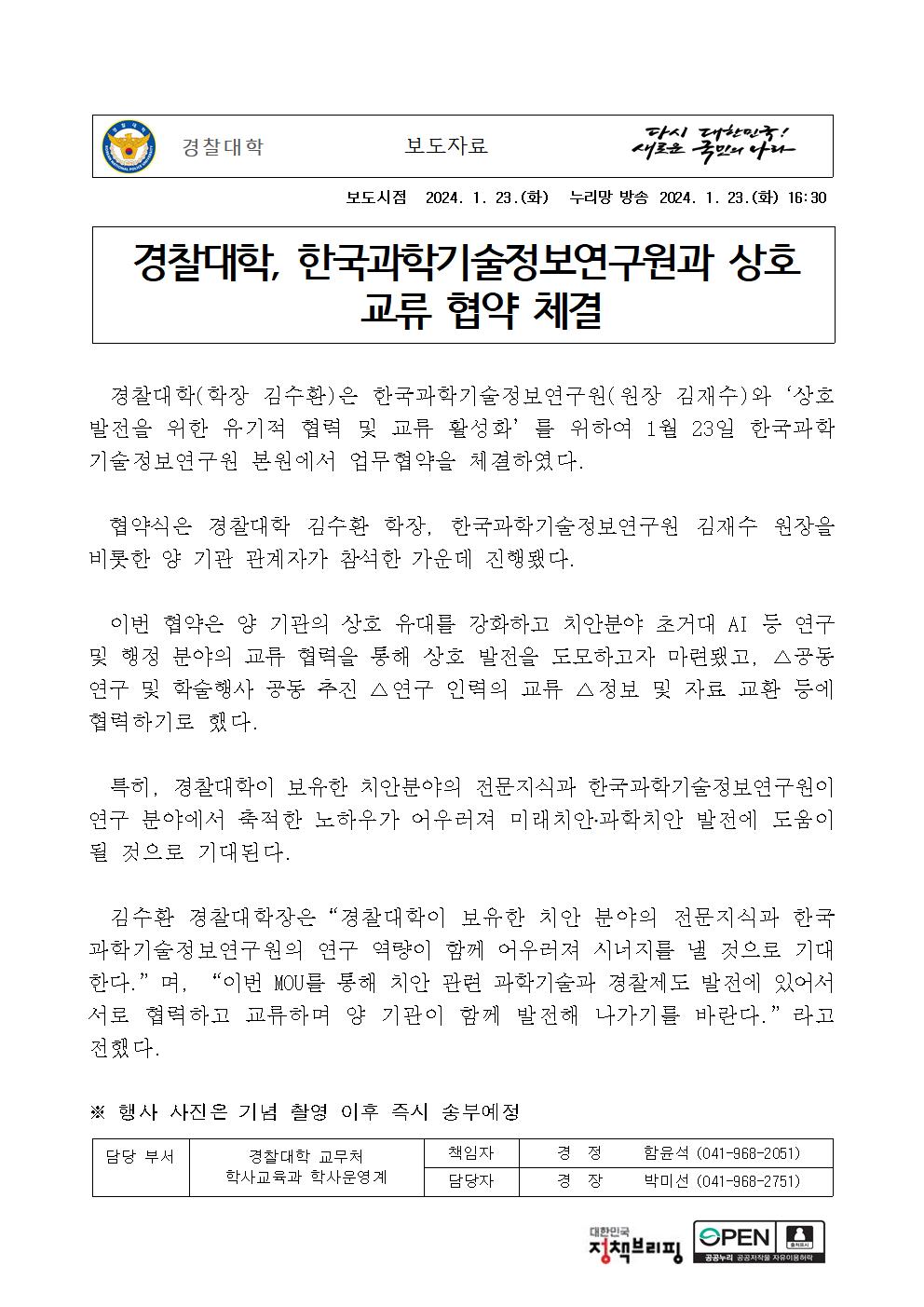 240123 (16시30분) 경찰대학 한국과학기술정보연구원 MOU체결(배포용).hwp