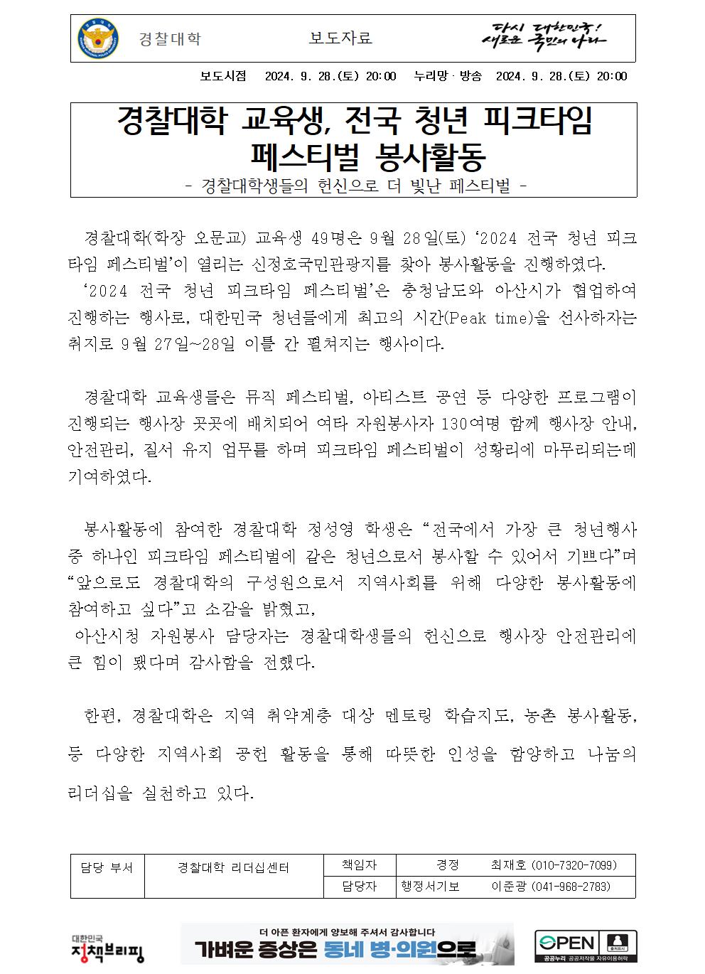 경찰대학 교육생, 전국 청년 피크타임 페스티벌 봉사활동