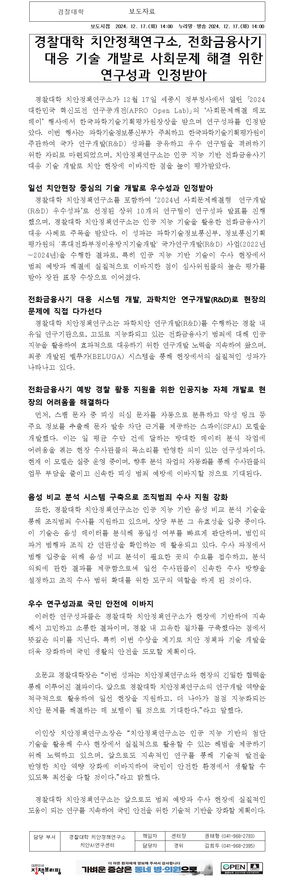 경찰대학 치안정책연구소 한국과학기술기획평가원장상 수상