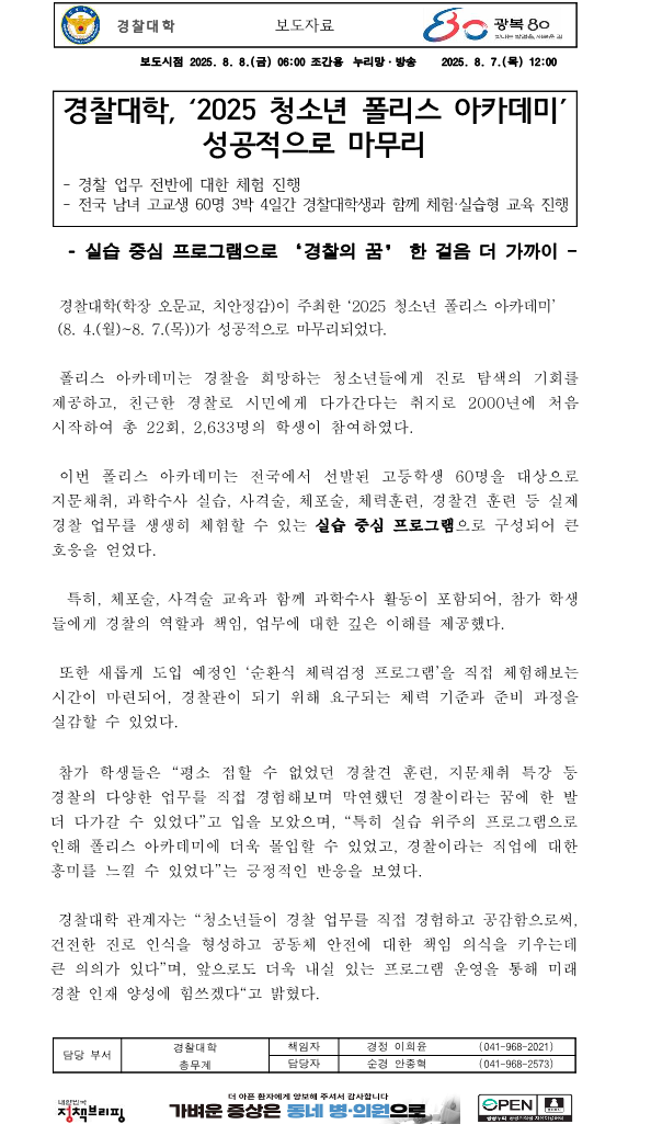 경찰대학, '2025 청소년 폴리스 아카데미' 성공적으로 마무리
