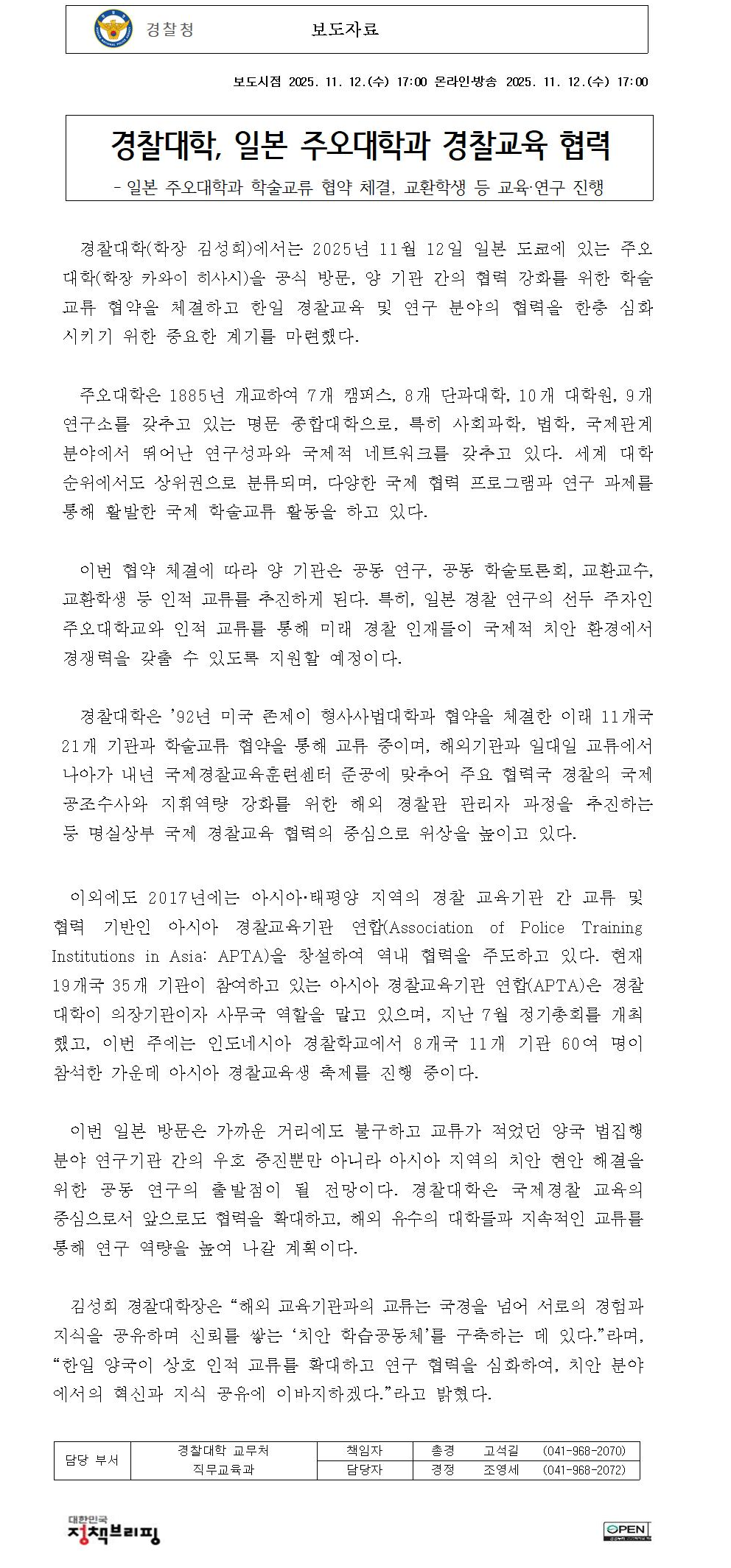 경찰대학, 일본 주오대학과 경찰교육 협력