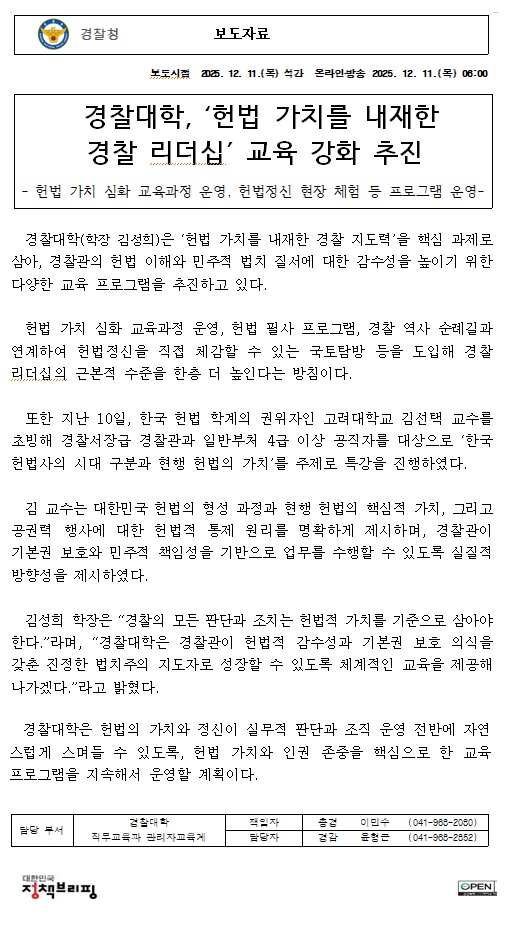 경찰대학, 헌법 가치를 내재한 경찰 리더십 교육 강화 추진