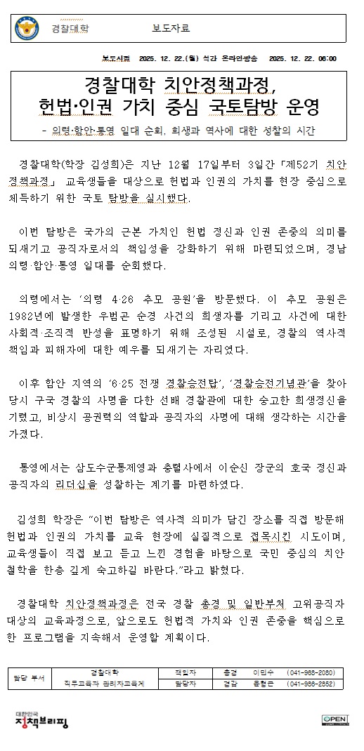 경찰대학 치안정책과정, 헌법·인권 가치 중심 국토탐방 운영