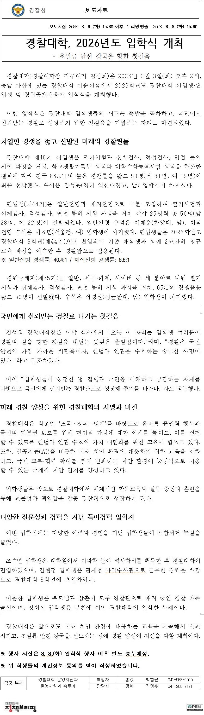 경찰대학, 2026년도 입학식 개최
